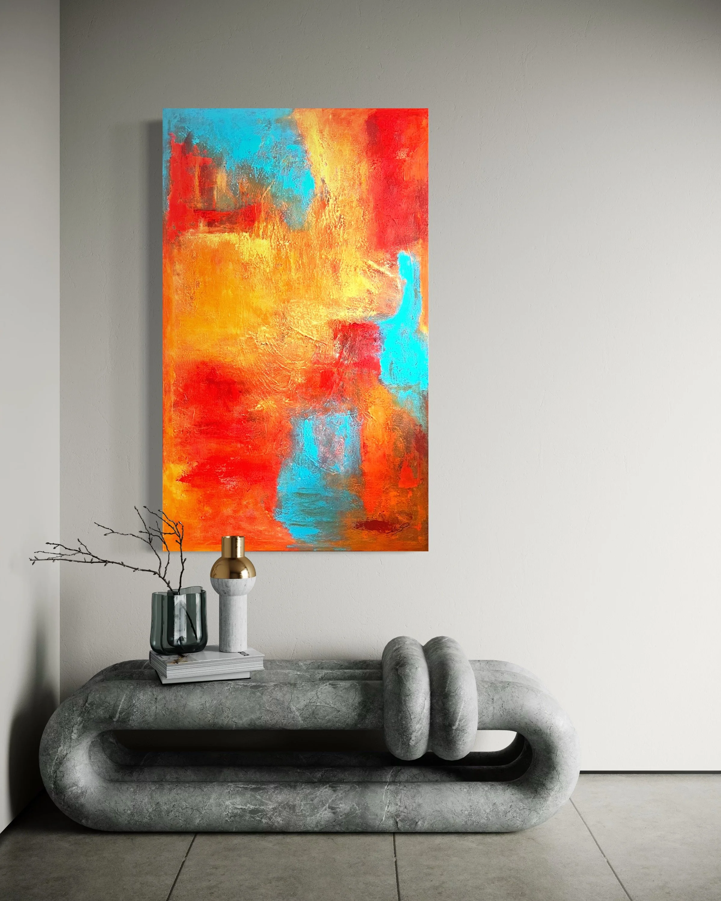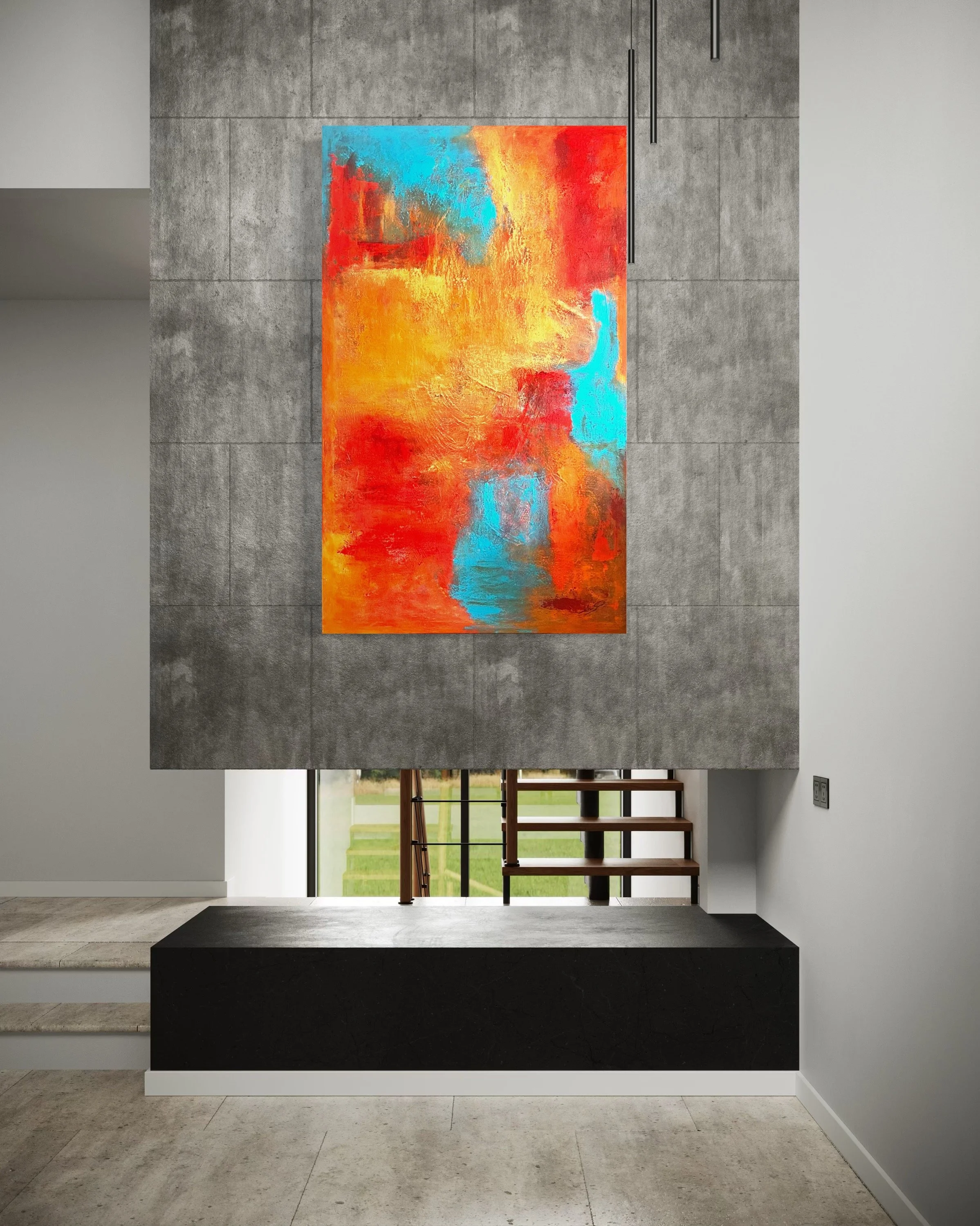 “Embers of Light evokes a glowing interior landscape where heat, air, and water intermingle. Through layered oranges, crimson reds, and breathing passages of turquoise, the painting suggests a quiet combustion — a slow radiance that transforms darkness into warmth.”